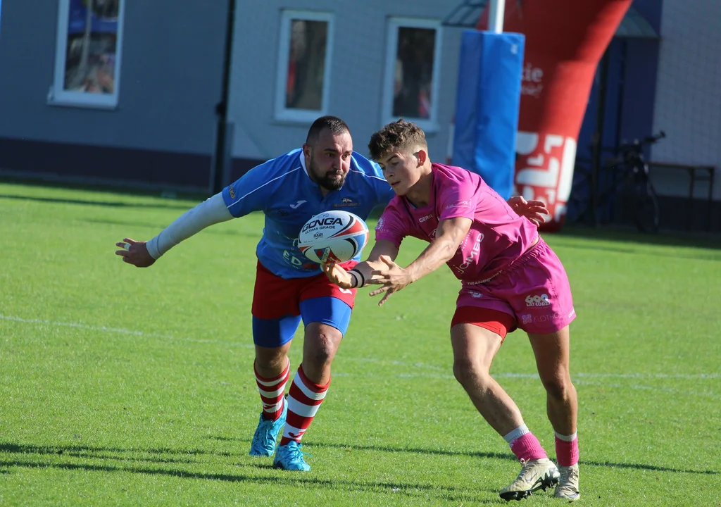 W 11. minucie goście otworzyli wynik za sprawą przyłożenia Makarego Madeja. Zawodnik drugiej linii zespołu z Łodzi zameldował się z piłką w polu punktowym po świetnym, indywidualnym rajdzie przez połowę boiska. Chwilę później po skutecznym kopie między słupy podwyższył Lucas Niedzwiecki. Edach Budowlani ruszyli do odrabiania strat. Sygnał do ataku dał Kuziwakwashe Kazembe, który wykorzystał rzut karny w 20. minucie gry. Prowadzenie zapewnił miejscowym natomiast Michał Pasieczny. To właśnie ten zawodnik zanotował przyłożenie po ładnej akcji całej drużyny. Zaraz potem Kazembe zdobył dwa kolejne oczka. Pod koniec pierwszej połowy po ataku prawym skrzydłem przyłożył zaś Thomas Pena, a następnie podwyższył Niedzwiecki. Gdy wydawało się, że przyjezdni zejdą na przerwę z korzystnym rezultatem, w samej końcówce niebiesko-biało-czerwoni odrobili straty z nawiązką i to oni przystępowali do drugiej odsłony, wygrywając 17:14.