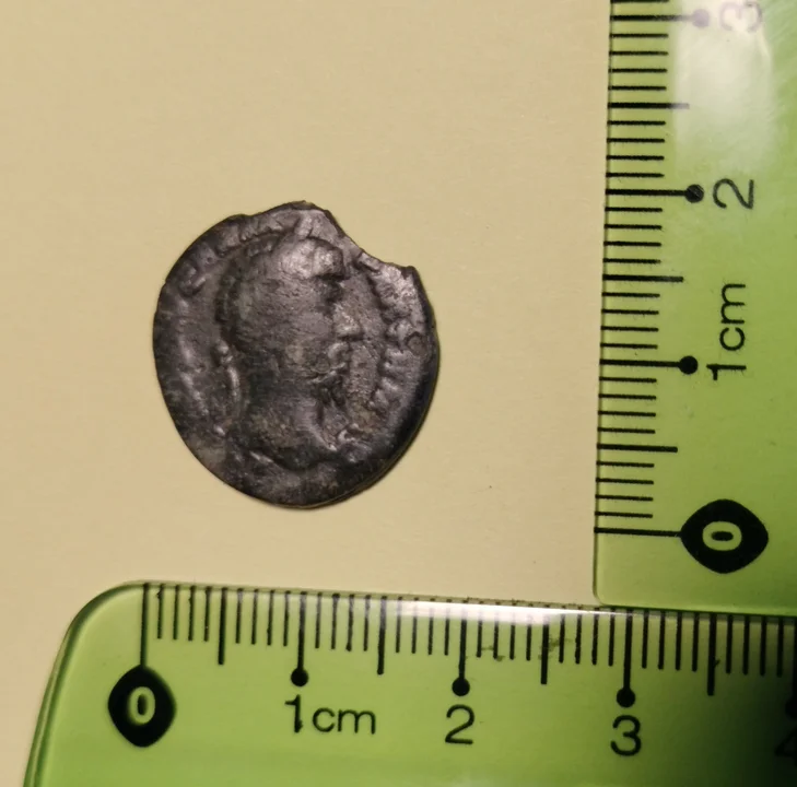 7. Falsyfikat srebrnego denara rzymskiego Antoniusa Piusa wybijanego w Rzymie w latach 138-161, podróbka wykonana przez Gotów z kultury wielbarskiej – słabo czytelny awers z podobizną cesarza i naśladownictwem napisu