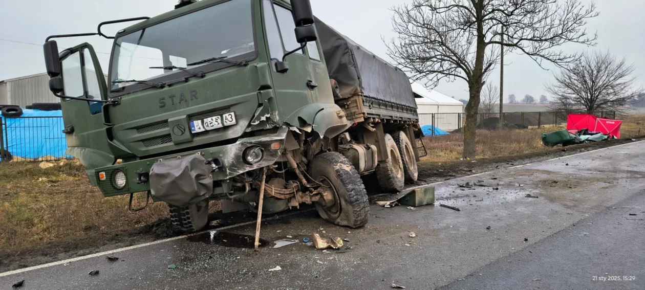 - Następnie przystąpiono do uwolnienia zakleszczonego kierowcy samochodu osobowego przy pomocy elektrycznych narzędzi hydraulicznych. Do momentu wydobycia osoby poszkodowanej z wraku pojazdu i przekazaniu Zespołowi Ratownictwa Medycznego była prowadzona wentylacja kierowcy niestety życia mężczyzny nie udało się uratować. Poszkodowany żołnierz miał lekkie obrażenia głowy i został zaopatrzony przez Zespół Ratownictwa Medycznego na miejscu zdarzenia. Następne działania polegały na odłączeniu zasilania w pojeździe Star 266. Z uwagi na zadysponowanie do zdarzenia śmigłowca Lotniczego Pogotowia Ratunkowego wyznaczono miejsce do lądowania na zamkniętym odcinku Drogi Krajowej 74 - opisuje KP PSP w Hrubieszowie.