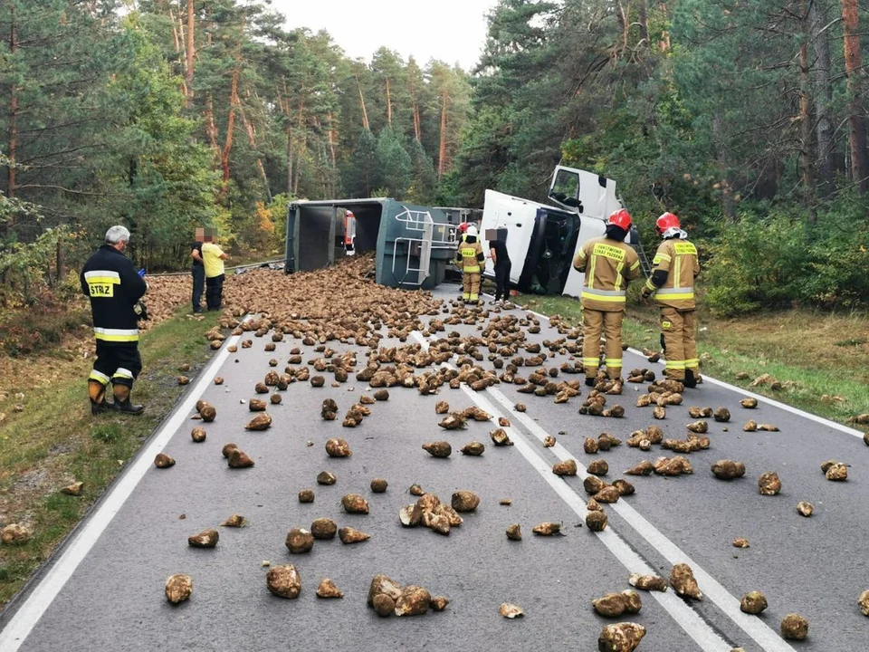 - Skierowani na miejsce policjanci ustalili, że 34 letni mieszkaniec gminy Tereszpol kierując ciężarowym Renault z naczepą nie dostosował prędkości do warunków panujących na drodze. Mężczyzna na łuku drogi stracił panowanie nad pojazdem w wyniku czego doszło do jego wywrócenia. 34 latek przewoził na buraki cukrowe, które rozsypały się na jezdnię całkowicie blokując drogę - informuje aspirant Joanna Klimek z KPP w Biłgoraju.