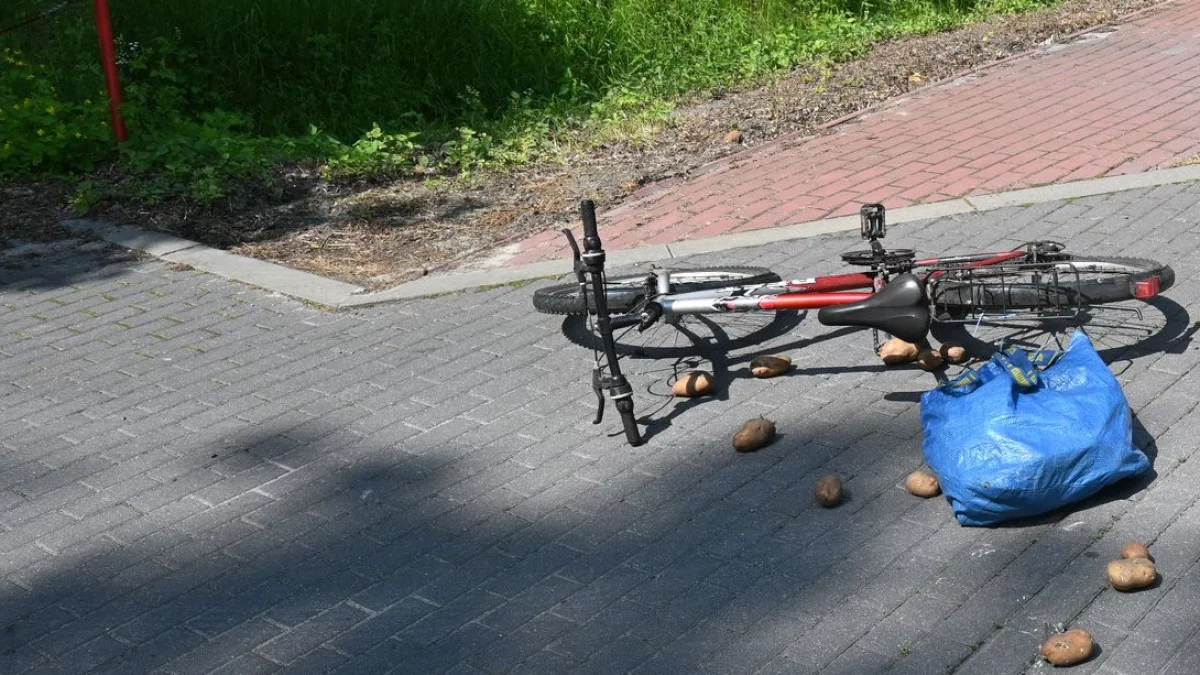Do kontaktu obu pojazdów doszło na prostym odcinku drogi. Po zderzeniu motocykl przewrócił się na pobliską trawę, a rower wraz z przewożonymi ziemniakami upadł na bruk. Obaj kierujący odnieśli obrażenia i zostali przetransportowani do szpitala.