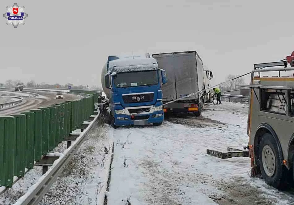 Na zjeździe z drogi S17 w kierunku Zamościa w miejscowości Piaski Wielkie (powiat świdnicki) 45-letni obywatel Ukrainy kierując cięarówką w wyniku niedostosowania prędkości do warunków na drodze uderzył w drugą ciężarówkę, która zatrzymała się z uwagi na problem z kontynuowaniem jazdy związany z oblodzeniem jezdni. Kierowcy byli trzeźwi. Policjanci wytyczyli objazdy.