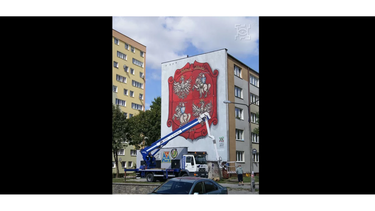 Radny wyjaśnia w poście, że we wrześniu 2015 roku, na ścianie szczytowej jednego z bloków przy ulicy Hutniczej w dzielnicy Tatary powstał mural. Przedstawiał tarczę herbową, a na niej zdwojone godło Polski oraz litewską "Pogoń".