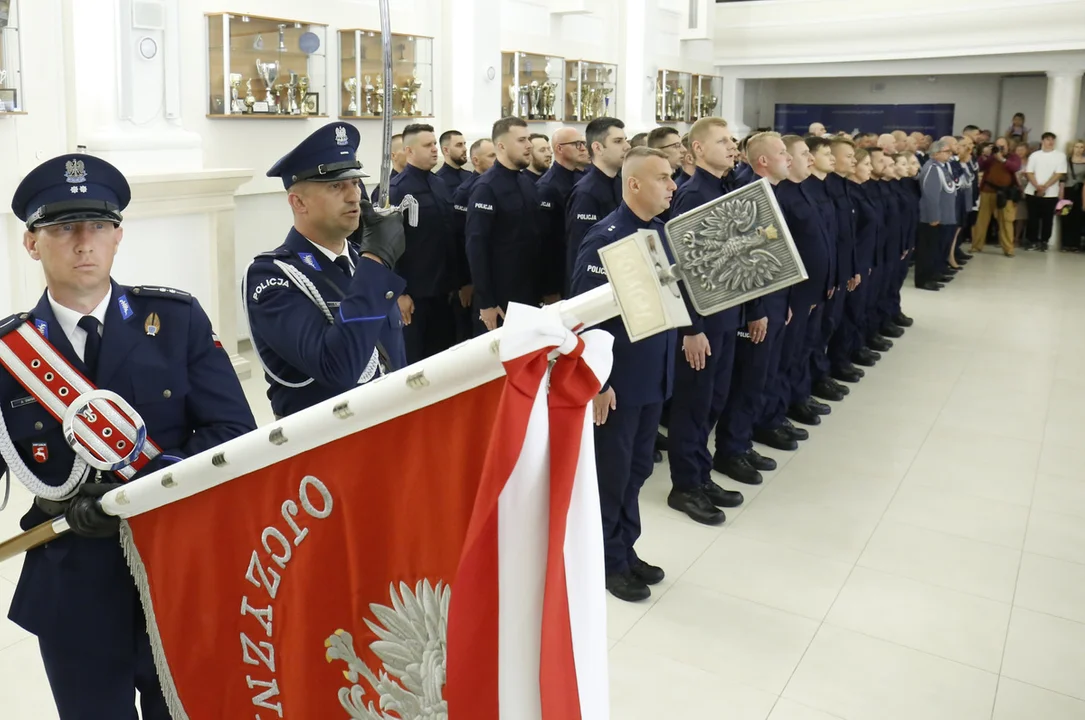 Młodych funkcjonariuszy powitał w naszych szeregach Komendant Wojewódzki Policji w Lublinie - młodszy inspektor Tomasz Gil. Z rąk komendanta nowi stróże prawa otrzymali legitymacje służbowe.