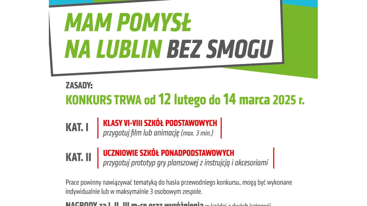 - Dodatkowym celem jest promowanie działań na rzecz poprawy jakości powietrza w Lublinie oraz rozwijanie kreatywności i umiejętności artystycznych oraz technicznych uczestników. Inicjatywa skierowana jest do dwóch grup wiekowych: uczniów klas VI-VIII szkół podstawowych, których zadaniem będzie stworzenie krótkiego filmu lub animacji (maks. 3 minuty), oraz uczniów szkół ponadpodstawowych, którzy stworzą projekt i wykonają prototyp gry planszowej. Tematyka wszystkich tych form ma nawiązywać do głównego tematu konkursu, jakim jest Lublin bez smogu - wyjaśnia Monika Głazik z biura prasowego w Kancelarii Prezydenta Miasta Lublin.