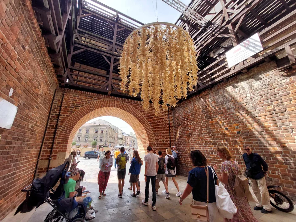 Pająk to dawna ozdoba ludowa, którą dekorowano izbę z okazji świąt. Pająki wieszane są od kilku lat w Bramie Krakowskiej i zapowiadają jedno z największych świąt kultury tradycyjnej – Festiwal Re:tradycja – Jarmark Jagielloński. W tym roku trwa on od piątku (23 sierpnia) do niedzieli (25 sierpnia). Instalację wykonała Ewelina Kruszyńska.