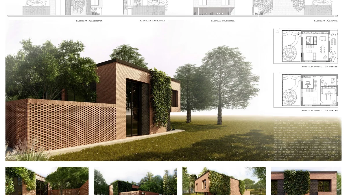 . Ideą konkursu jest budowanie świadomości piękna architektury ceglanej oraz propagowanie klinkieru jako najszlachetniejszego z materiałów elewacyjnych. Studenci konkurują w dwóch kategoriach: dom jednorodzinny i budownictwo przyszłości. To właśnie w pierwszej z tych kategorii sukces odniosły studentki III roku architektury Politechniki Lubelskiej. Magdalena Wrona i Dominika Włodek zdobyły nagrodę publiczności w towarzyszącym zmaganiom konkursie Architektury&Biznesu. Stworzony przez studentki Politechniki Lubelskiej „Brick Oasis” to dwukondygnacyjny dom jednorodzinny, posiadający unikalny wygląd. Bryła budynku składa się z dwóch prostopadłościanów o przesuniętej geometrii i przykryta jest zielonym stropodachem. Wejście do domu zostało zaakcentowane ażurowym murem, który otacza strefę wejściową - opisuje Politechnika Lubelska.
