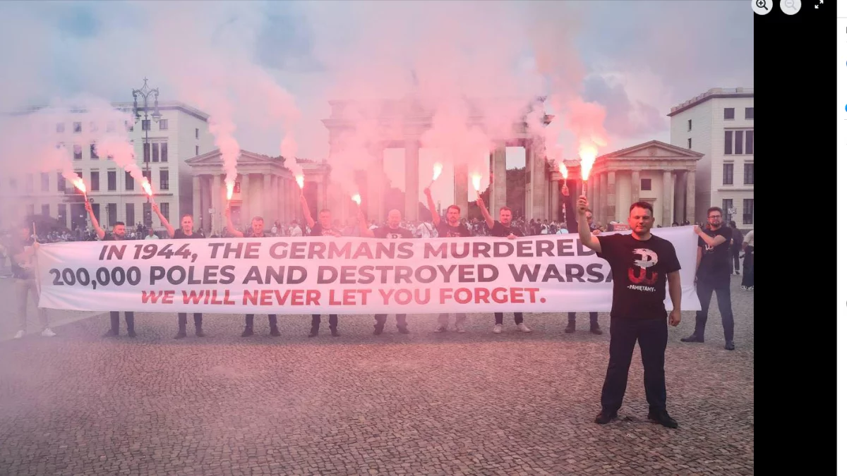 To właśnie w godzinę „W” na placu przed Bramą Brandenburską w Berlinie politycy Konfederacji na czele ze Sławomirem Mentzenem i politykami należącymi do Nowej Nadziei rozwinęli transparent. Na nim był napis: „W 1944 roku Niemcy zamordowali 200 tys. Polaków i zniszczyli Warszawę. W godzinę „W” odpalono również race.