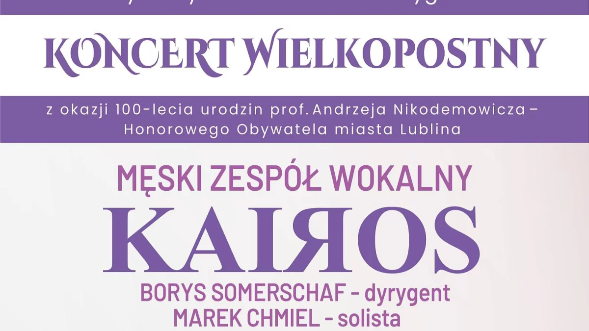W niedzielę (6 kwietnia) odbędzie się koncert z okazji 100-lecia urodzin prof. Andrzeja Nikodemowicza. Wydarzenie zaplanowano na godz. 18.45 w Kościele Rekroralnym pw. Wniebowzięcia NMP Zwycięskiej przy ul. Gabriela Narutowicza 6 w Lublinie. W koncercie weźmie udział Męski Zespół Wokalny KAIROS, solista Marek Chmiel (bas baryton) oraz dyrygent Borys Somerschaf. W programie znajdą się utwory kompozytora, śpiewy cerkiewne, fragmenty liturgii ormiańskiej oraz śpiewy hebrajskie.